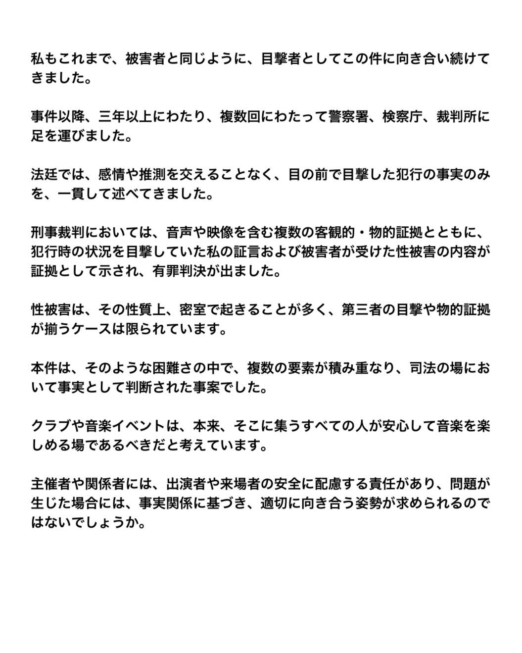 また、本件の証言を行った目撃者もコメントを公開している。